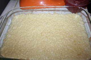 This week's Tuesdays with Dorie, Baking with Julia recipe is Hungarian Shortbread. I am not really sure what makes this Hungarian, but everything in it made it delicious. The recipe calls for two layers of sweet shortbread with a tartly tasty layer of rhubarb "jam" made with rhubarb, sugar, water, and vanilla bean squished in between.